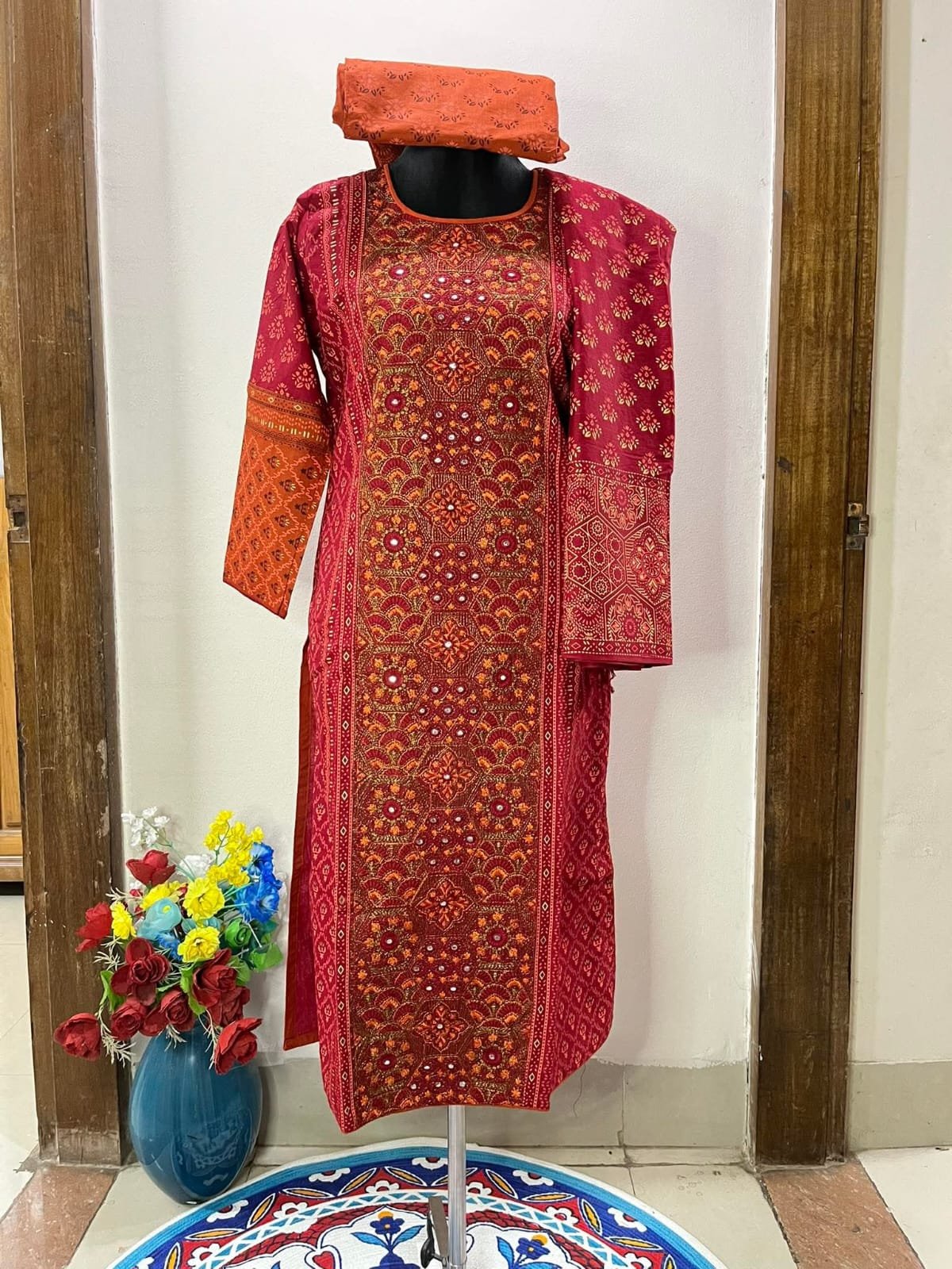 ড্রেস : অল ওভার ব্লক প্রিন্ট এবং আফসান, এমব্রয়ডারি, ডলার এবং জরি সুতার কাজ করা। সাথে পাইপিং করা।