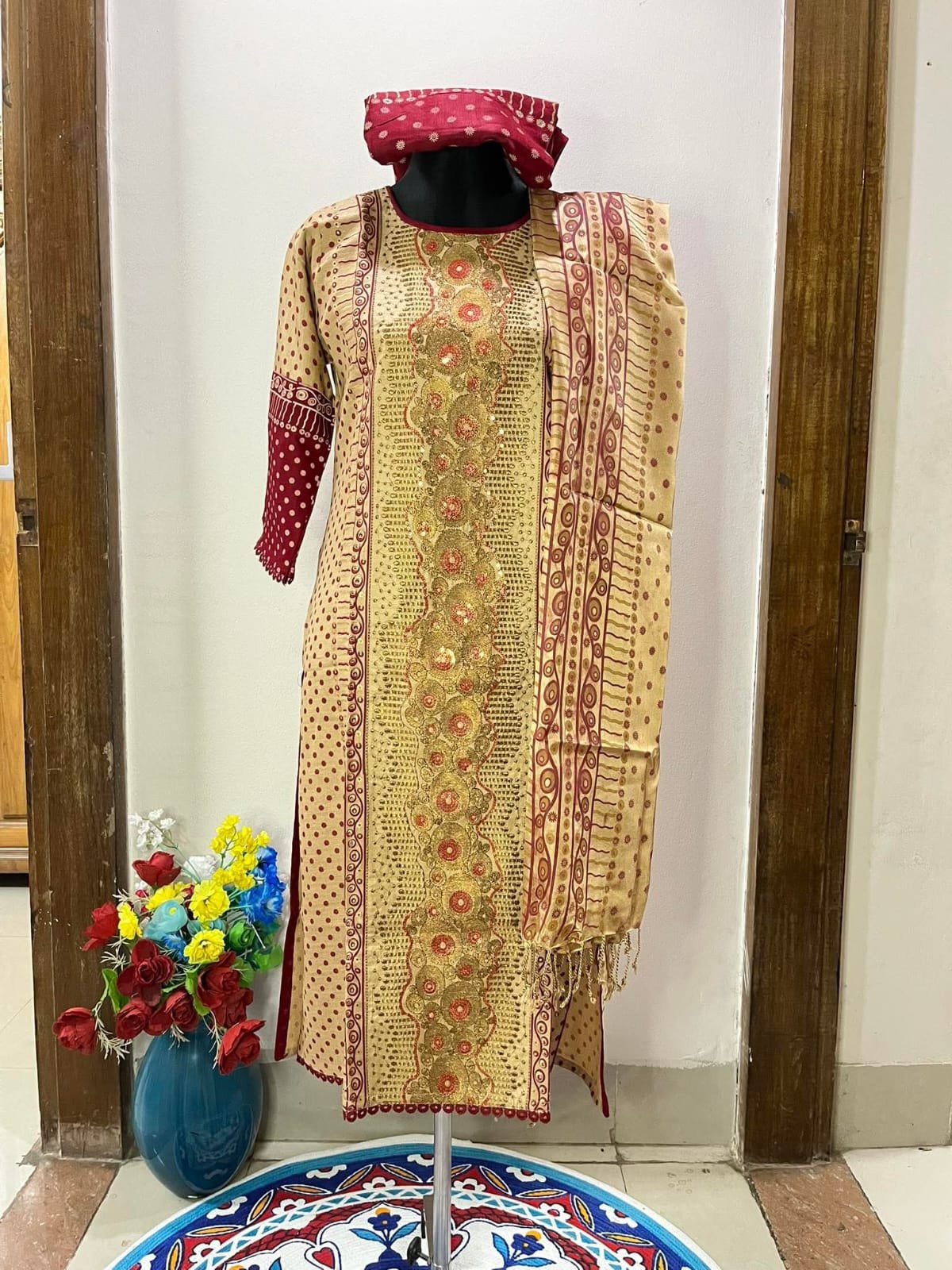 ড্রেস : অল ওভার ব্লক প্রিন্ট এবং আফসান, এমব্রয়ডারি, চুমকি এবং জরি সুতার কাজ করা। সাথে পাইপিং করা। হাতায় লেইচ আছে।