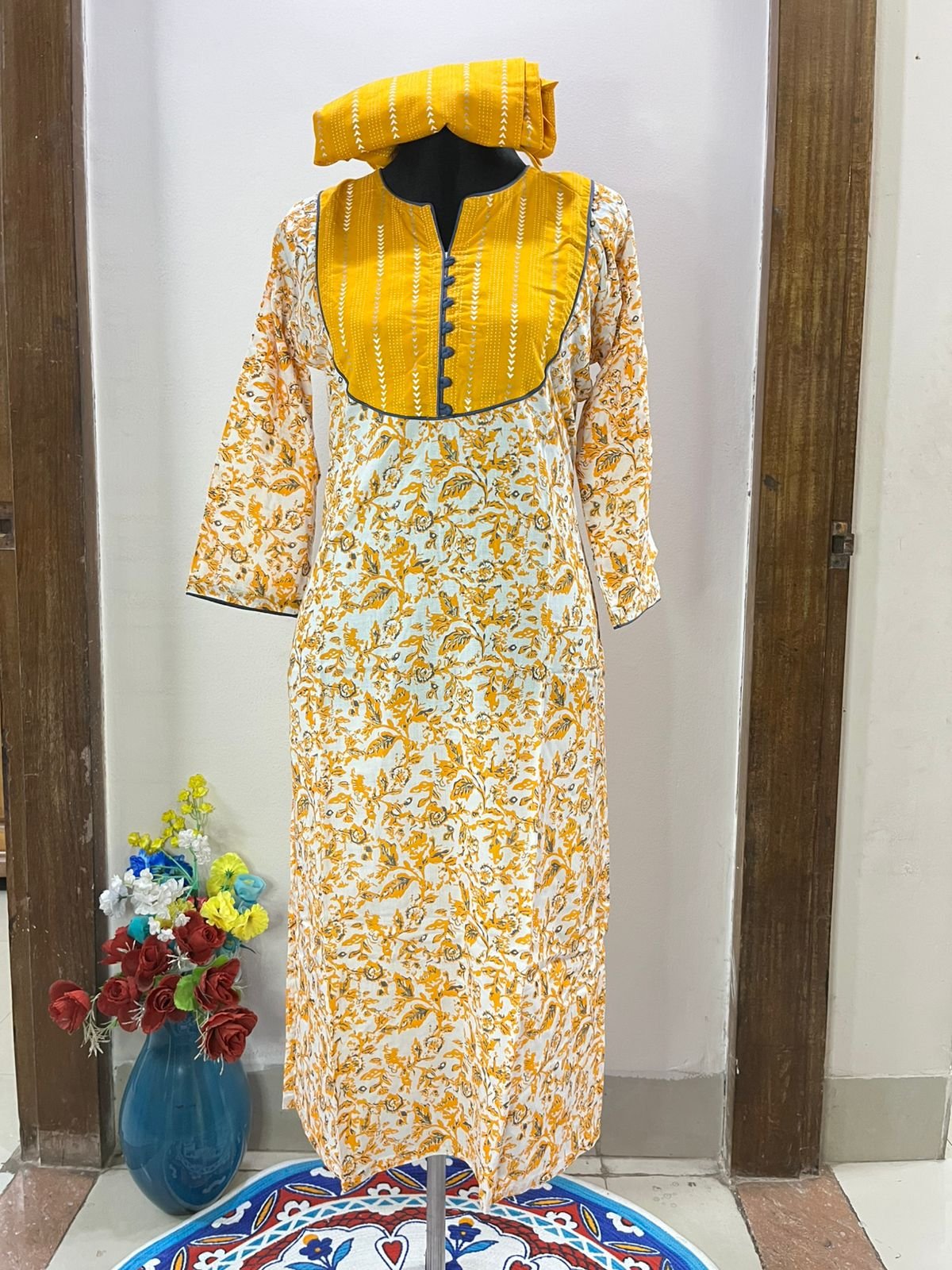 ড্রেস : অল ওভার স্কিন প্রিন্ট এবং সাথে পাইপিং করা।